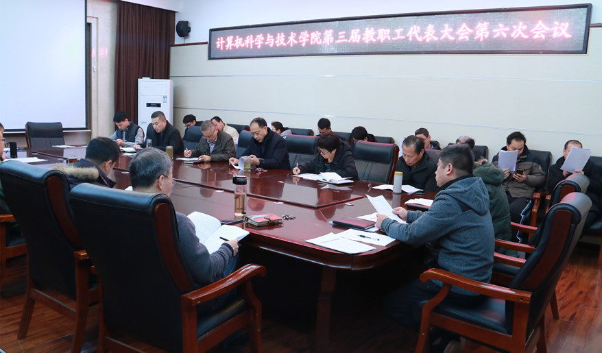 首先,邵水军对学院2019年工会工作以及工会财务情况向与会代表进行汇报;孙君顶对《计算机科学与技术学院薪酬分配办法(草案)》(以下简称《办法》)的相关内容以及修订背景和依据进行详细解读;赵珊对学院2019年包干经费分配方案及经费明细进行总结汇报,并报告2020年包干经费分配方案及明细预算。随后,参会教代会代表对《办法》进行了审议和讨论并且以表决方式,一致通过了上述文件制度。最后,朱天明从薪酬分配、学院经费方案、专业认证及寒假培训四个方面发表了讲话,希望大家在新的一年再接再厉,为学院工作继续贡献力量。