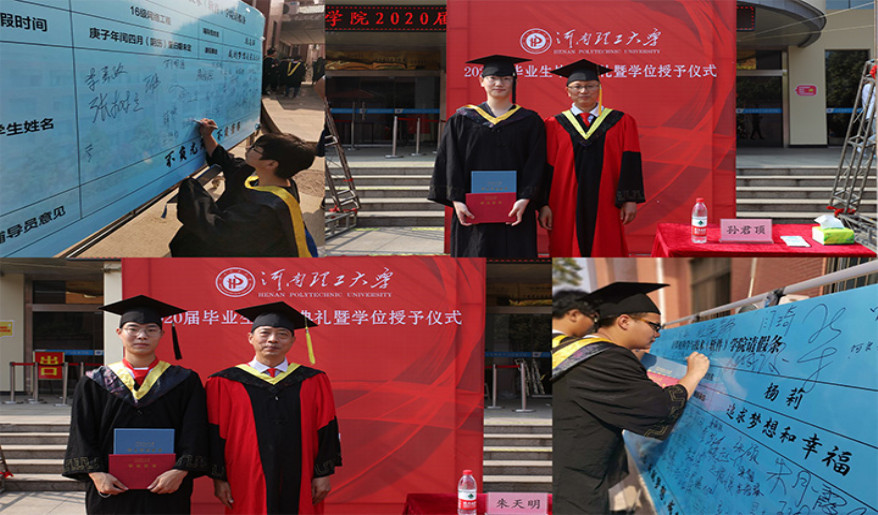 在激昂的加冕进行曲中毕业典礼暨学位授予仪式正式拉开帷幕,全体毕业生依次有序上台受礼,接受学有所成、圆满毕业的“拨穗礼”,为每一位毕业生进行学位授予仪式合影留念。学院领导和辅导员分别寄语毕业生们坚定理想、执着信念、诚信做人,踏实做事,顽强拼搏,以奋斗之底色,描绘最亮丽的人生画卷。随后,毕业生们纷纷在创意“请假条”毕业生墙上写下名字,表达自己对母校的不舍与留恋。整个学位授予仪式庄严隆重,气氛热烈。毕业生们满怀欣喜与学院领导、同学、亲友合影留念,向母校、恩师、同窗表达着浓浓眷恋与深切感恩之情。