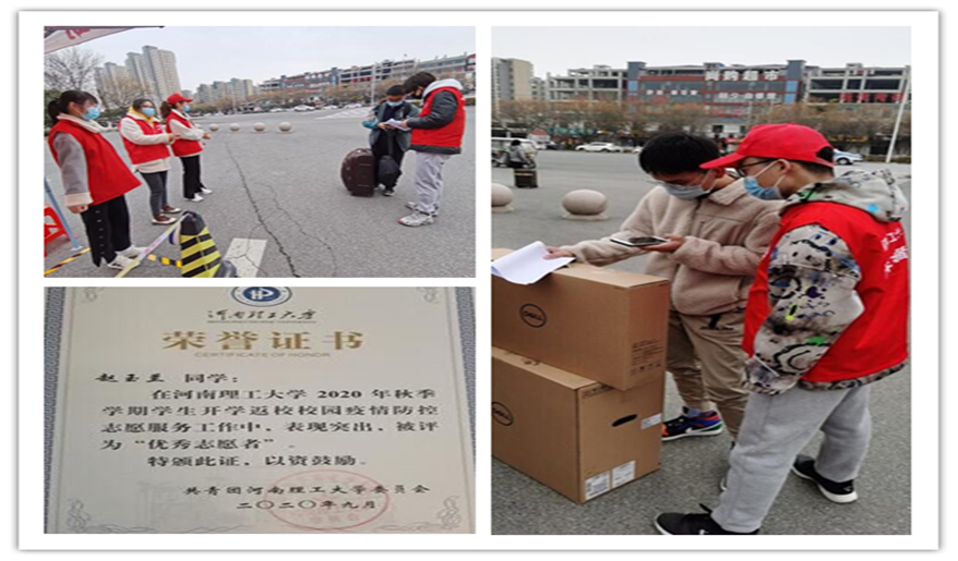 赵玉兰:“自疫情暴发以来,全国各地的无数医生和护士主动请缨,支援抗击疫情的战斗。他们的事迹深深鼓舞了我,作为一名大学生,我没有理由袖手旁观,我要为“抗疫”工作奉献自己的一份力量。通过这次的志愿服务,我真切体会到了一线工作人员的辛苦,我相信在党和政府的领导下,我们一定能够战胜疫情,共克时艰。在开学之际,学校发布招募校园疫情防控志愿者,我便积极参与,且成功成为其中的一名志愿者,组织返校生有秩序的进入校园,并帮助他们将行李送进校园。在此活动中,表现突出,被评为“优秀志愿者。”
