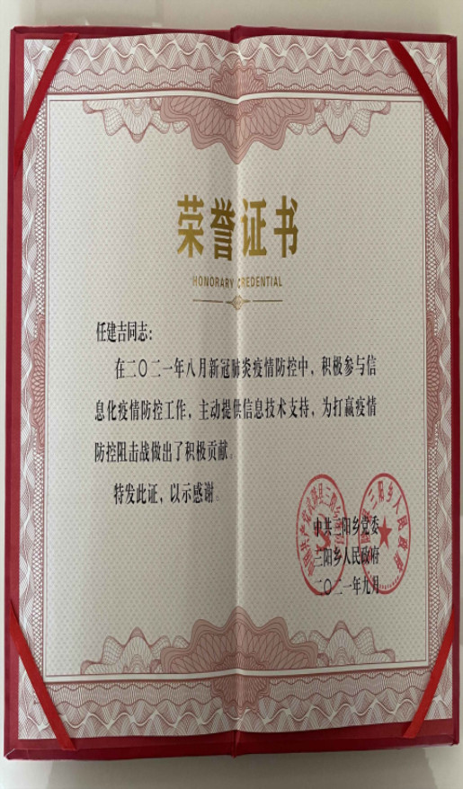 近日,武陟县三阳乡政府向我院教师任建吉颁发疫情防控荣誉证书,以表彰其在 “零接触”登记系统开发中做出的突出贡献。