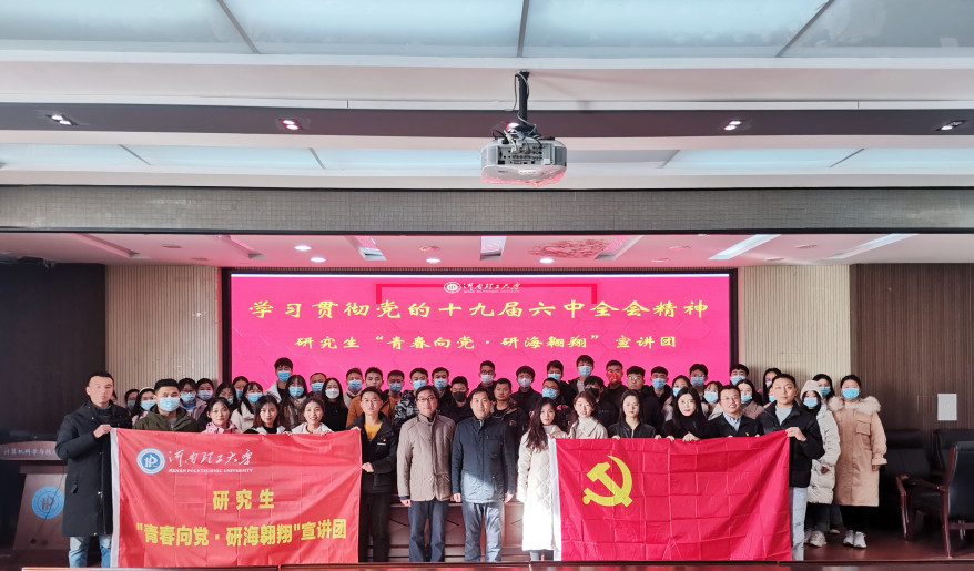 为学习贯彻党的十九届六中全会精神,汲取前行的智慧和力量,引导我院研究生永远听党话、跟党走,11月30日上午,河南理工大学研究生“青春向党•研海翱翔”宣讲团在我院201会议室开展宣讲报告会。研工部副部长孙彦、研工部学生管理科郭飞鹏出席并聆听了本次报告会。我院21级专硕1班全体学生参加了本次活动。