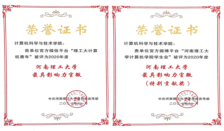 2020年度学院团委在校团委和院党委的正确领导下,两个新媒体平台在内容制作、文化宣传、服务师生等方面富有特色和成效,通过这两个平台为学院新媒体建设作出支持和贡献,推动了学校及学院的整体影响力。“问渠那得清如许,为有源头活水来”,学院团委不断推陈出新,有想法,有情怀,微信原创作品《线上祭英烈,云端祭哀思》与《快来选择你心目中的计算机女神吧》荣获河南理工大学2020年度“新媒体优秀原创作品”三等奖。通过防汛救灾、疫情防控的宣传,引导广大同学们把灾难当教材,与祖国共成长。此外通过在两个新媒体平台上发布学院组织的各种会议,学术报告及学生各类活动等。在积极宣传党的思想,加强对广大团员青年的政治意识和思想教育工作起到了积极影响。