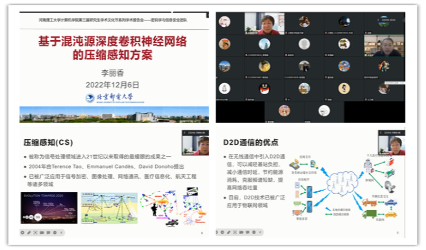 12月6日上午,我院有幸邀请到北京邮电大学李丽香教授参加我院第三届研究生学术文化节,为学院师生线上作题为《基于混沌源深度卷积神经网络的压缩感知方案》的学术报告,汤永利教授主持报告会,部分教师和课题组研究生参加报告会。