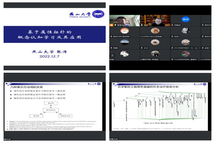 12月7日上午,燕山大学教授张涛应邀参加我院第三届研究生学术文化节,为我院、软件学院师生线上作了题为《基于属性拓扑的概念认知学习及其应用》的学术报告,软件学院智慧来副教授主持报告会,部分教师和研究生参加报告会。