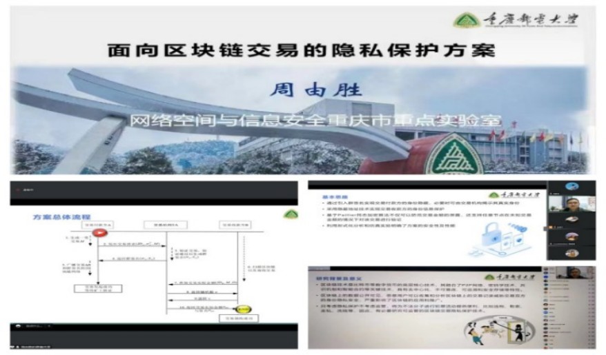 为进一步推进学科发展、营造良好科研氛围,近日,重庆邮电大学教授周由胜应邀参加学院第三届研究生学术文化节,为我院、软件学院师生线上作题为《面向区块链交易的隐私保护方案》的学术报告。会议由我院教授彭维平主持,部分教师和课题组研究生参加。