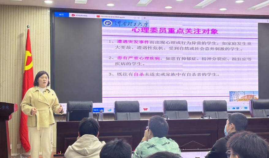 汪志英首先通过讲述自身大学期间担任宿舍长的经历与宿舍情谊,引起了同学们的共鸣,之后引用著名心灵读物《小王子》中小王子与狐狸关于“驯养”的对话,告诫宿舍长要通过建立宿舍成员间的良好关系来诠释爱是责任的工作真谛。其次向同学们讲述了班干部的工作职责,带领同学们认识了心理危机的概念、类型、引发原因,应重点关注的对象,如何识别心理危机,并正确处理危机事件。