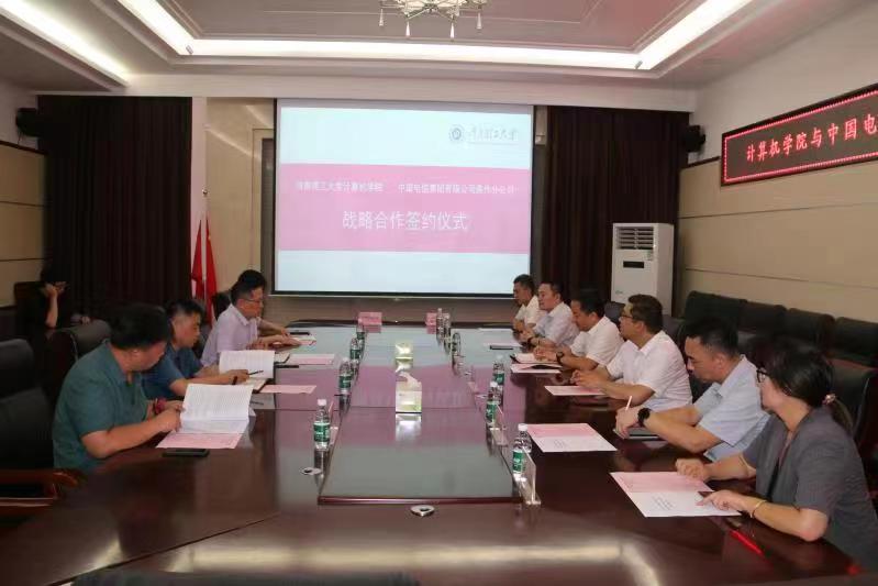 为推动教育数字转型、智能升级、融合创新,支撑教育高质量发展,7月10日上午,计算机学院与中国电信集团有限公司焦作分公司战略合作框架协议签约仪式在学院217会议室举行。河南理工大学计算机学院院长孙君顶及部分班子成员,中国电信集团有限公司焦作分公司党委书记、总经理于云昊及班子成员,以及计算机系、物联网系部分教师出席签约仪式。