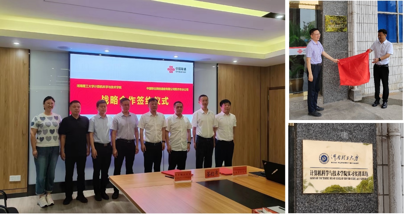 为促进校企产学研合作,提高我校计算机类专业人才培养质量,7月11日上午,计算机科学与技术学院与焦作市联通公司校企合作签约仪式在联通公司会议室举行。焦作市联通公司副总经理程小海及相关部门负责人,计算机科学与技术学院院长孙君顶、班子部分成员和相关专业负责人参加了校企合作签约会议以及揭牌仪式。