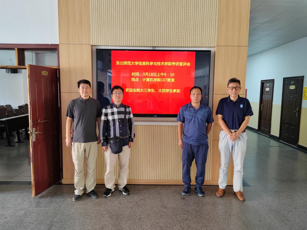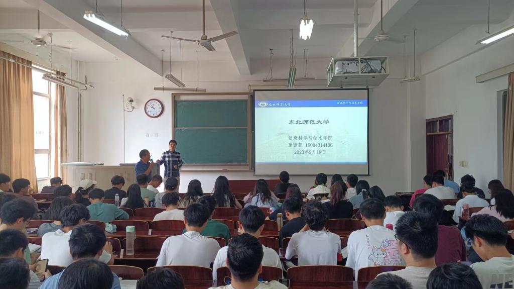 2023年9月18日上午,东北师范大学信息科学与技术学院计算机系副主任冀进朝、封子军两位老师在学院107教室召开了研究生招生宣传讲座。全体2021级计算机科学与技术专业本科生参加了讲座。