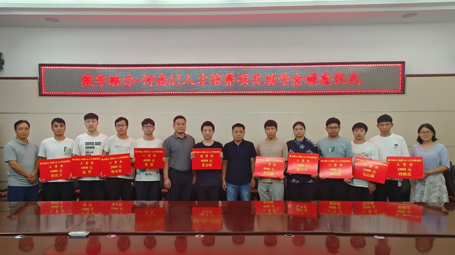 2023年9月21日,我院在学院217会议室举行河南理工大学数字助力-河南AI人才培养项目助学金颁发仪式,向百度人工智能菁英班的10位优秀学生共计发放了助学金24000元,校友办主任、校办副主任、校教育发展基金会理事长范永明和计算机学院副院长王磊出席了颁发仪式。