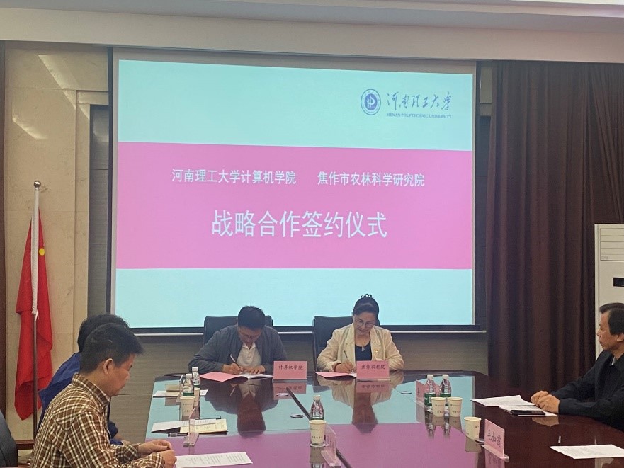 9月27日,计算机学院与焦作市农林科学研究院技术合作协议签约仪式在学院217会议室举行。河南理工大学计算机学院院长孙君顶、副院长冯文峰、副院长王磊等,焦作市农林科学研究院党委书记、院长徐红霞及班子成员出席签约仪式。