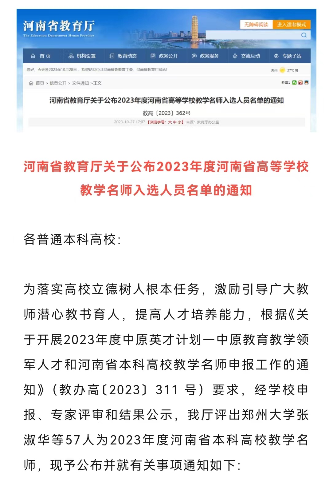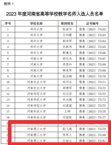 根据《关于开展2023年度中原英才计划—中原教育教学领军人才和河南省本科高校教学名师申报工作的通知》(教办高〔2023〕311 号)要求,经学校申报、专家评审和结果公示,计算机学院教师贺军义入选河南省高校教学名师。
