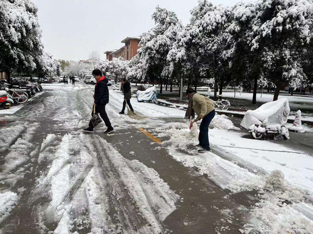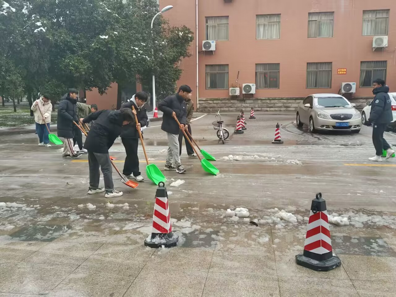活动中,志愿服务队在学院领导班子的带领下,迅速集结,以饱满的热情投入到除雪活动中。师生志愿者们手拿铁锹,齐心协力,分工明确,把学院周边道路、学院门前的积雪清扫干净,为师生开辟了一条安全之路。