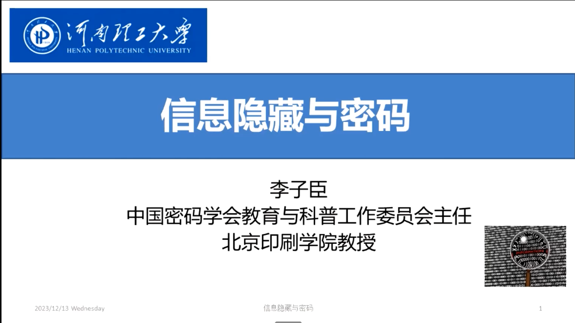 12月13日下午,北京印刷学院李子臣教授参加计算机学院第四届研究生学术文化节,为该院师生线上作题为《信息隐藏与密码》的学术报告,闫玺玺老师主持报告会,部分教师和课题组研究生参加报告会。