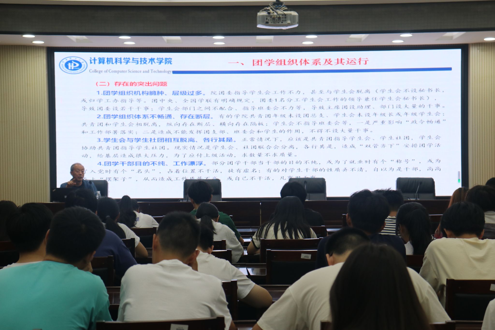 为推进团学组织体系改革,提升学生干部综合素质,发挥老干部老党员在学生思想政治教育工作中的重要作用,5月25日,计算机学院团委在学院报告厅举办学生骨干培训。学院团委、研究生会、学生会、班长联席会、青年志愿者协会等院级学生骨干的80余名同学参加培训,校关工委秘书处常务副秘书长朱天明主讲,学院团委书记岳磊主持。