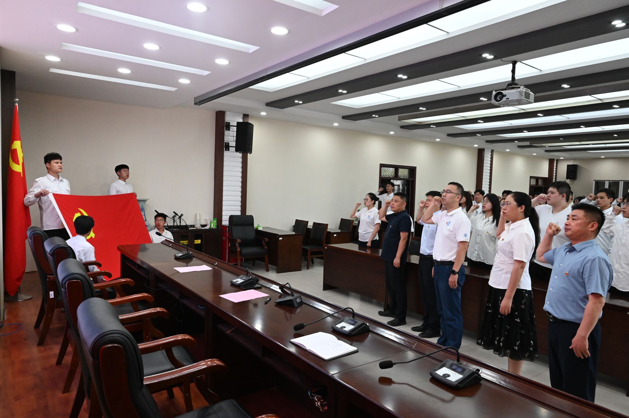 在庄严的国歌声中,活动拉开了帷幕。首先,冯文峰宣读了新发展党员名单,全体党员在候三中的带领下,高举右拳,庄严宣誓。在铿锵有力的誓词声中,党员同志们更加坚定了入党初心和奋斗使命。