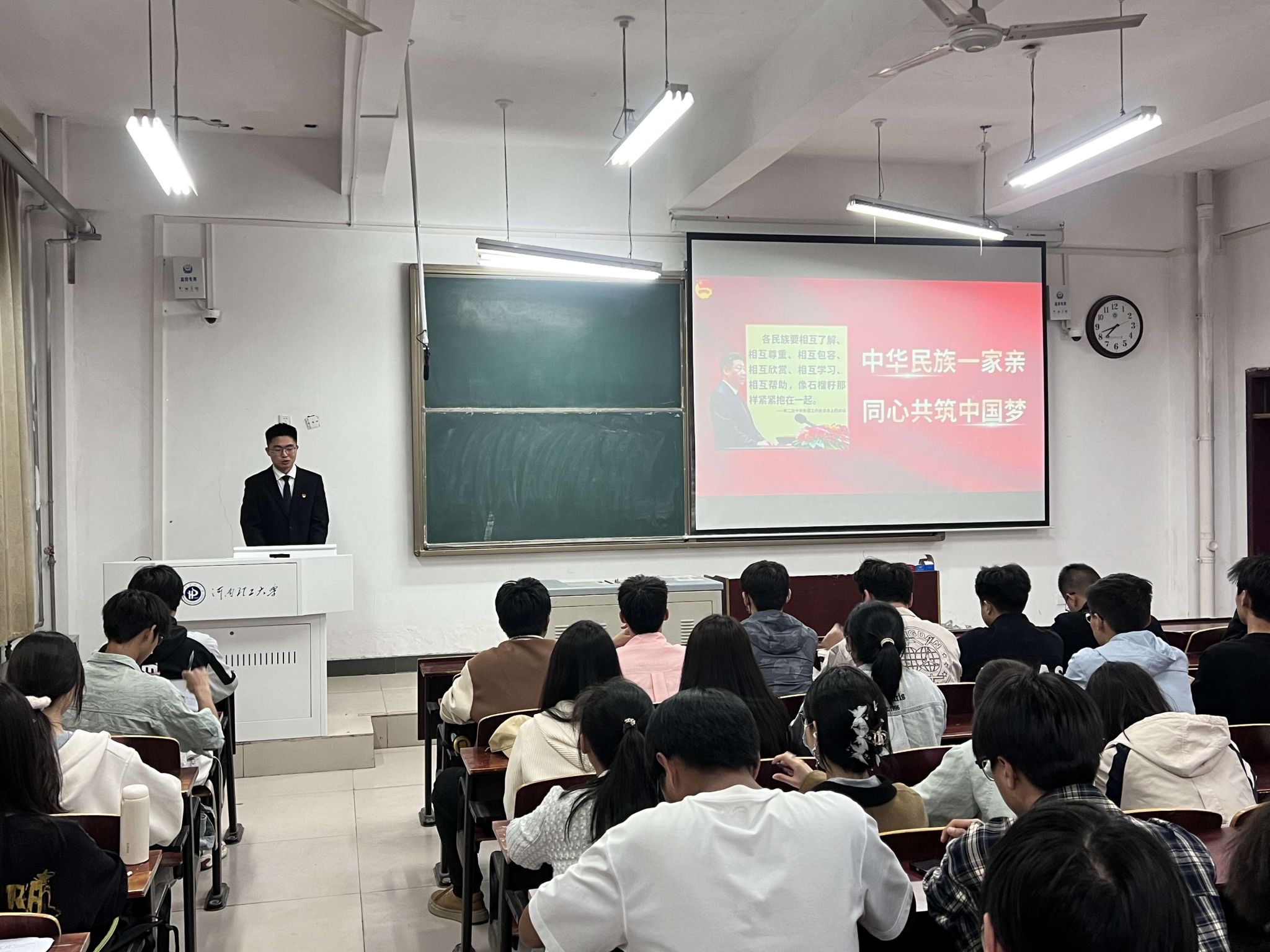 杨其麟以“志之所向,愿之所在”为主题,系统介绍了“西部计划”的政策内容以及研究生支教团的概况,他详细解读了研究生支教团的招募标准与政策保障,并在最后播放往届成员支教期间的影像记录,生动诠释“用一年不长的时间,做一件终生难忘的事”的服务理念,鼓励更多同学投身西部建设、贡献青春力量。刘博源以“中华民族一家亲,同心共筑中国梦”为主题,从中华民族共同体意识的理论建构、深刻认识铸牢中华民族共同体意识的重大意义、培育担当民族复兴大任的时代新人三部分展开介绍,让同学们认识到“各民族要像石榴籽那样紧紧抱在一起”的深刻内涵,引导青年学子以切实行动扛起实现民族复兴的时代重任。