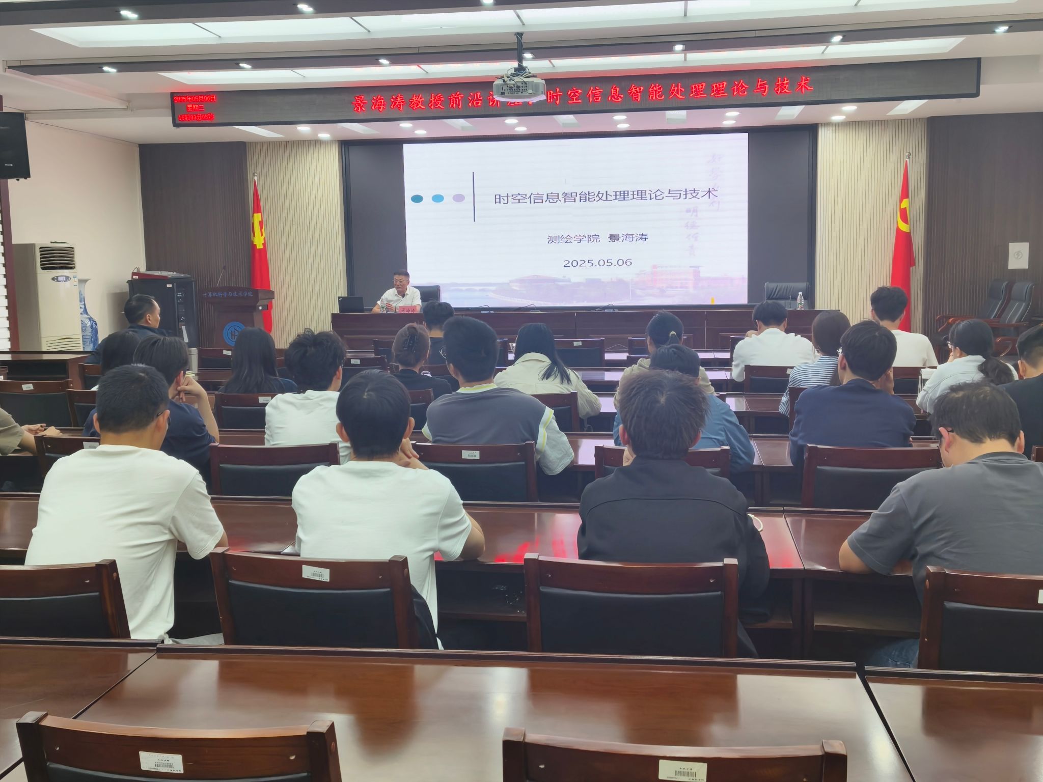 5月6日下午,我院邀请测绘学院教授景海涛在201会议室作题为“时空信息智能处理理论与技术”学术前沿讲座。讲座由学院副院长于金霞主持,2024级电子信息专业硕士研究生及部分教师代表近60人参加。