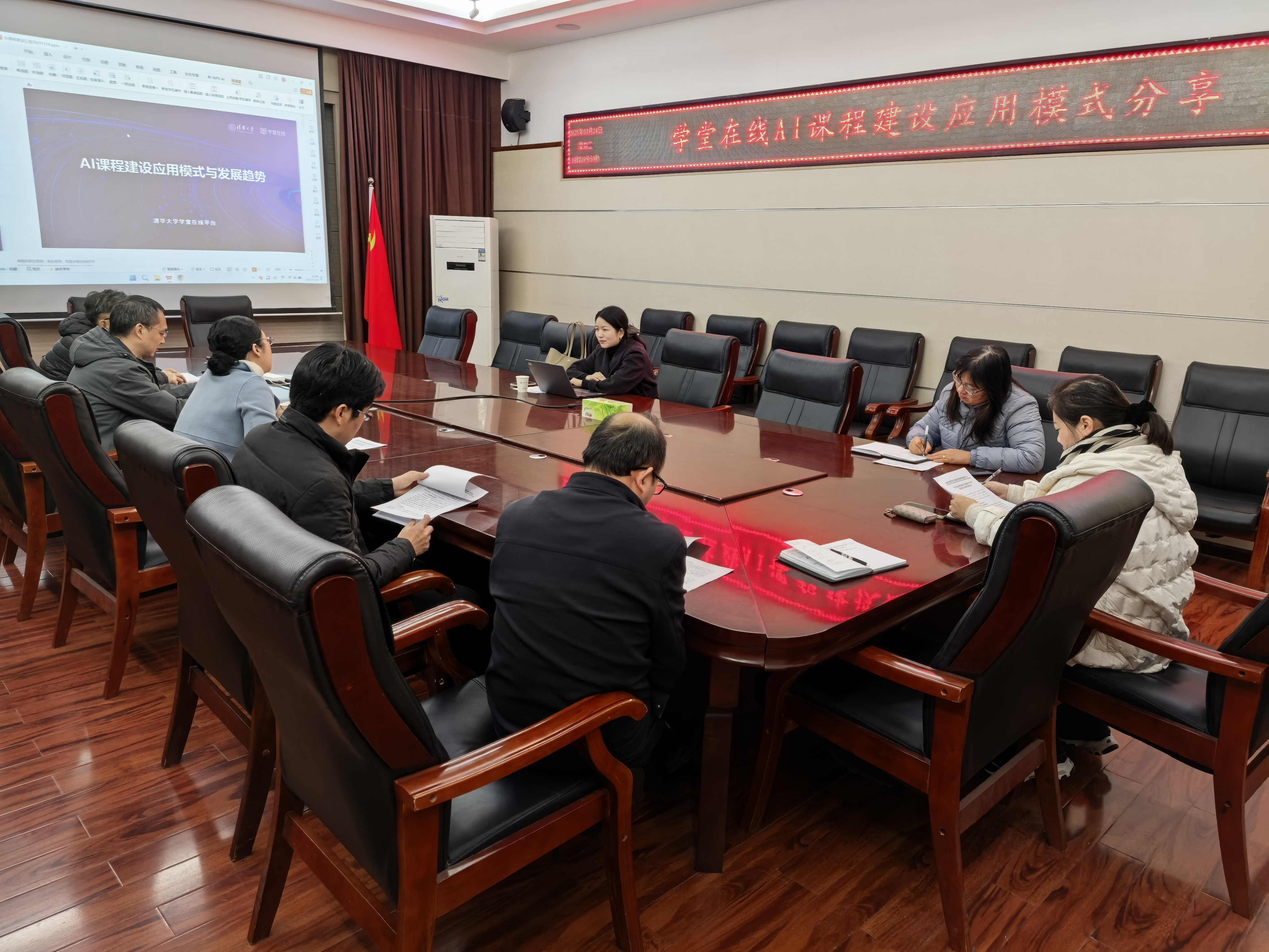 于金霞首先介绍参会人员及会议背景,并对刘经理的到来表示欢迎。随后,刘雪杨概述了学堂在线依托“产-学-研”机制,完成从数字化到智能化的发展历程。她结合国家与省级人工智能教育发展战略,阐述了高校建设AI课程的必要性与紧迫性,并通过展示清华大学、北京理工大学等高校的成熟案例,直观呈现了高质量AI课程的建设样貌。她还针对学院实际情况,提出了四项具体的课程建设建议,并介绍了AI课程在后续教学中的应用方式。最后,与会人员就课程构建的具体细节、版权归属等关键问题进行了详细讨论。