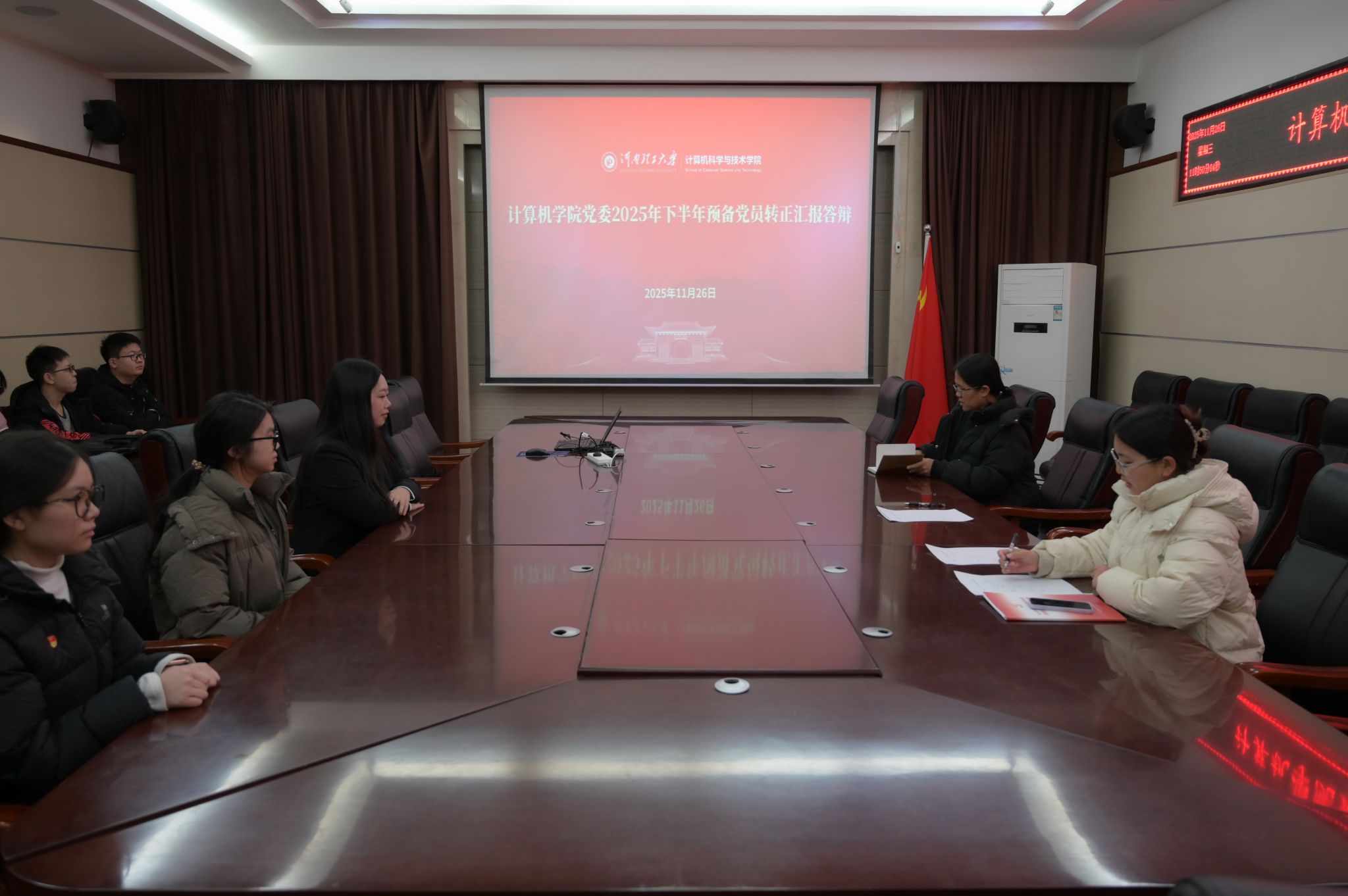为拧紧党员发展“质量阀”,强化党员队伍先进性建设,11月26日,计算机学院党委组织开展2025年下半年预备党员转正汇报答辩,18名拟转正预备党员参与答辩,学院党委委员、支部书记组成答辩组,2025年新接收的预备党员同步列席旁听。