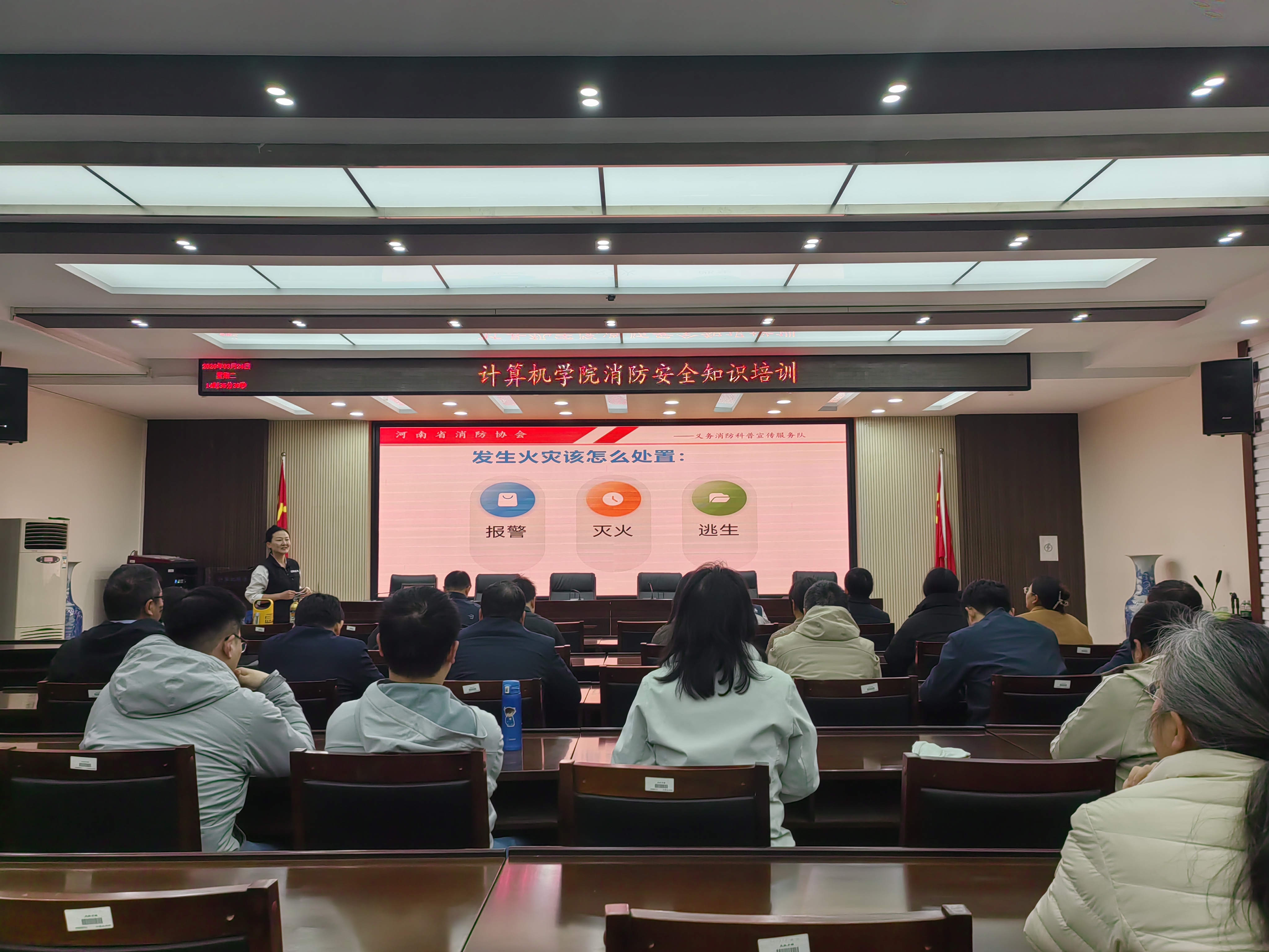 为进一步增强全体教师的消防安全意识,提升自防自救及应急处置能力,3月24日下午,学院在201会议室举办消防安全知识专题培训。本次活动特邀河南省消防协会义务消防科普宣传服务队专职教员严寒担任主讲。学院党委副书记阎俊豪主持培训会,全体教师参加。