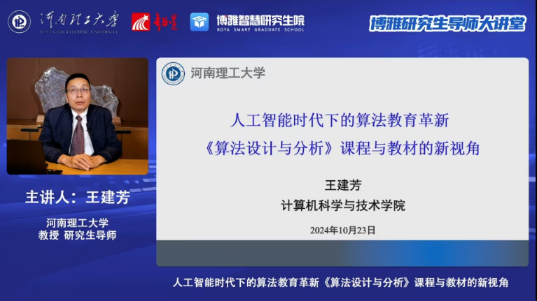 1023日晚,计算机学院研究生导师王建芳教授受超星集团邀请做客博雅研究生导师大讲堂,通过线上直播的方式,为全国研究生带来了一场题为人工智能时代下的算法教育革新-《算法设计与分析》课程与教材的新视角的精彩报告。