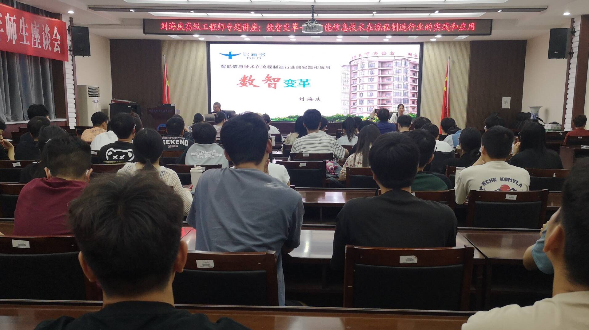 讲座上,刘海庆首先从科技创新、科研成果、业务范畴等方面介绍了多氟多公司信息化建设的基本情况;随后,从数字化转型的逻辑、新基建支撑数字化、业务数化数据赋能、一体化运管全场景、全AI智能面向未来五个模块分享了智能信息技术在流程制造行业的实践和应用,以及信息化建设为产业带来的变化和价值;最后,与现场师生进行问题交流,并诚邀电子信息专业的研究生在产业信息化方面共同努力、智慧创新。