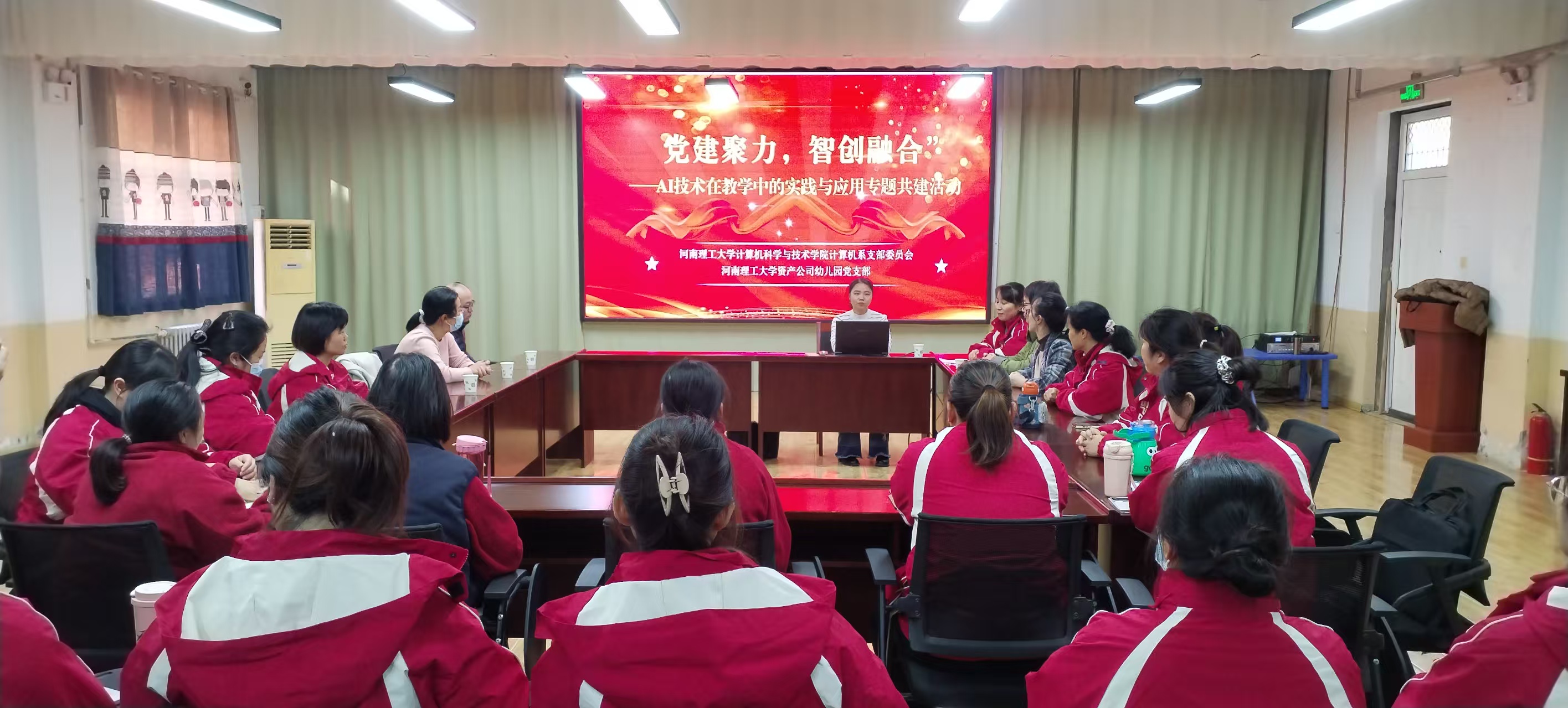 12月2日下午,计算机学院计算机系党支部与资产公司幼儿园党支部在河南理工大学幼儿园联合举办“党建联建、智创融合——AI技术在教学中的实践与应用”主题共建活动。活动以“人工智能赋能幼儿教学”为主题,通过专题讲座、互动研讨等形式,探索党建引领下的智慧教育新路径,推动人工智能与幼儿教育的深度融合。