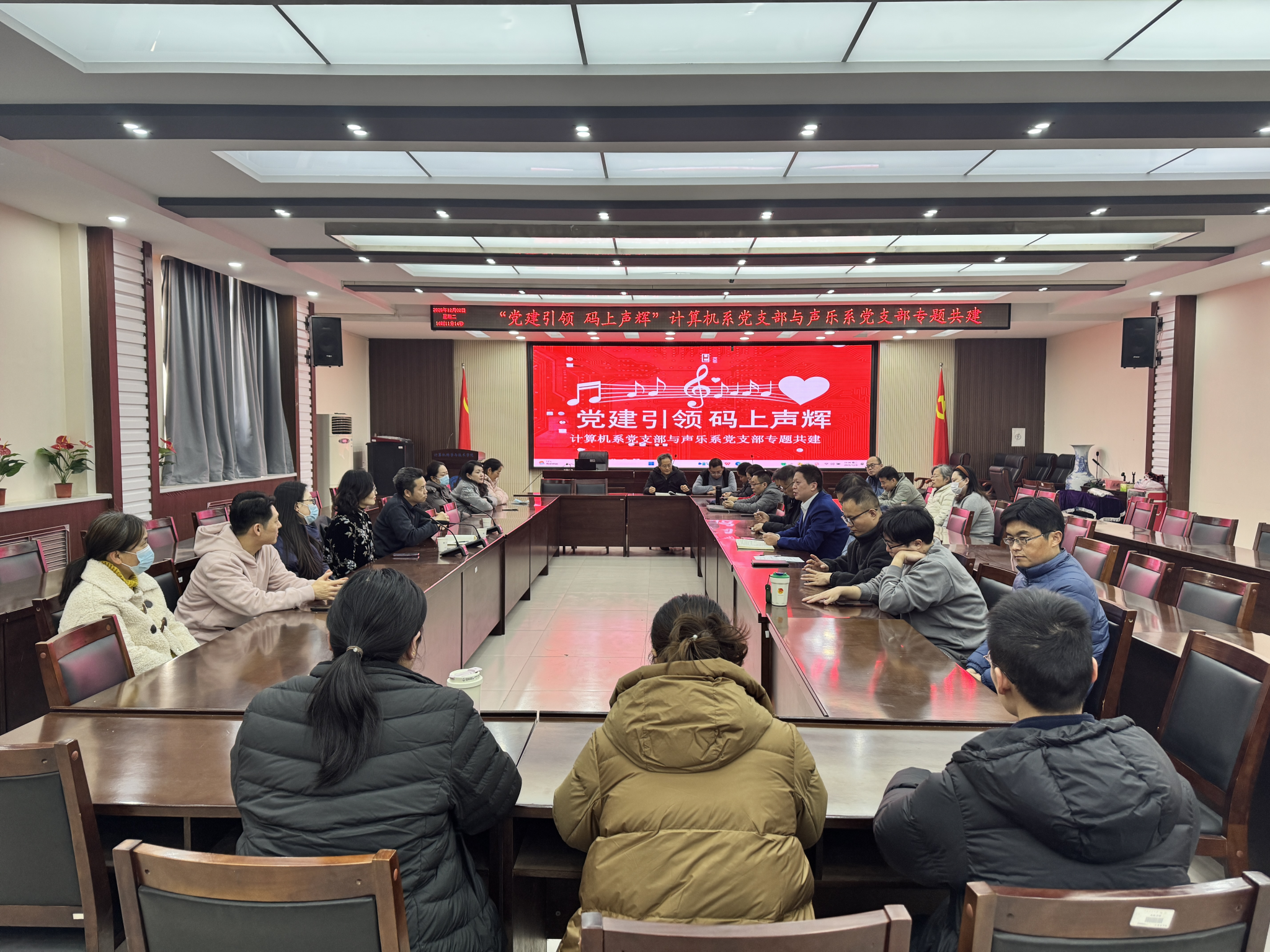 12月9日,计算机学院计算机系党支部联合音乐学院声乐系党支部在计算机学院201会议室开展“党建引领,码上声辉”基层党支部专题共建活动。计算机学院党委书记许辉、院长孙君顶,音乐学院党委副书记王建军、声乐系教工党支部书记孟天屹以及双方20余名党员教师参加活动,活动由计算机系教工党支部书记陈峰主持。