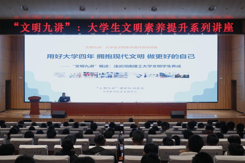 为提升学生文明素养,树立做文明学生成长目标,10月17日下午,计算机学院在第二图书馆A报告厅举办“文明九讲”——大学生文明素养提升系列讲座首场讲座。计算机学院党委副书记阎俊豪以《用好大学四年 拥抱现代文明 做更好的自己》为题,就如何做文明大学生及“文明九讲”主要内容进行宣讲。学院2023级全体本科生参加。