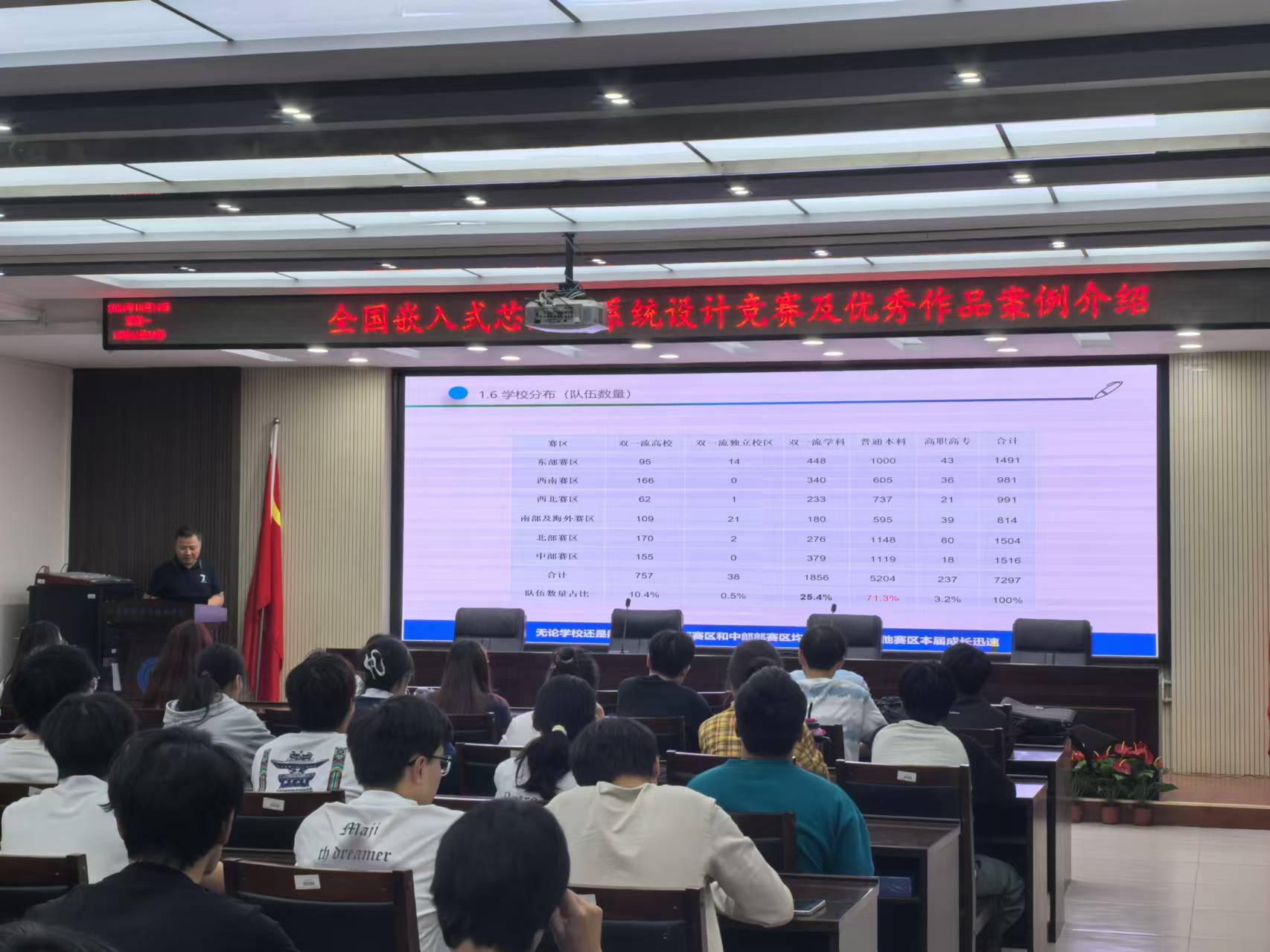 10月14日下午,计算机学院在学院201会议室举办全国大学生嵌入式芯片与系统设计竞赛及优秀作品案例介绍讲座,东南大学钟锐副教授主讲,物联网专业22级学生参加,计算机学院副院长王磊主持会议。