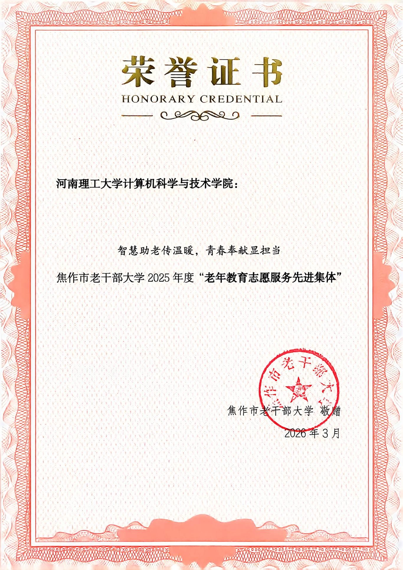 3 月 31 日,焦作市老干部大学为计算机学院颁发“老年教育志愿服务先进集体”荣誉证书,以此感谢学院长期开展的助老志愿服务。