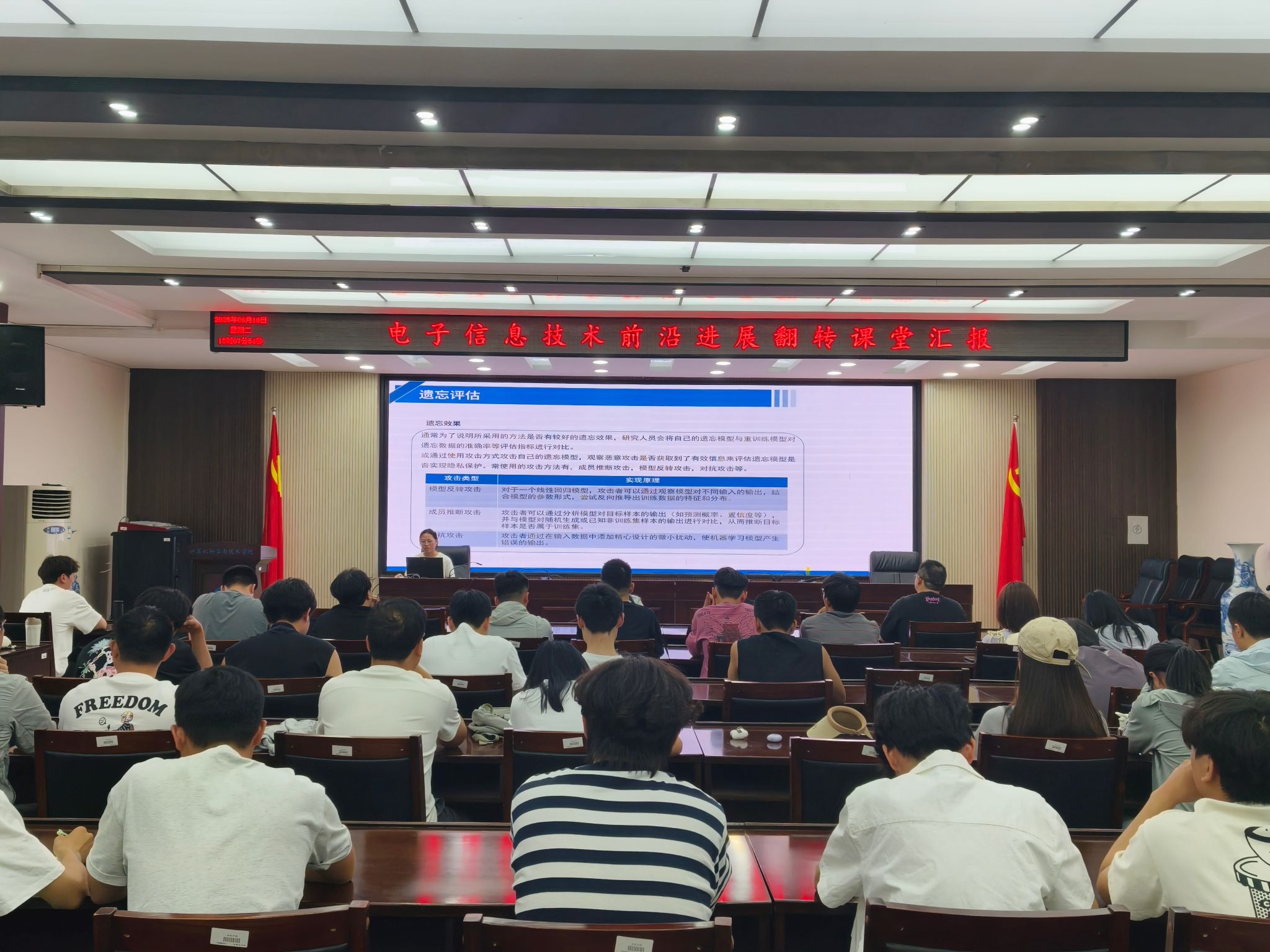 6月10日,电子信息技术前沿进展翻转课堂汇报在计算机学院201会议室开展。活动由主讲教师于金霞教授主持,物联网系主任张利红、研究生办公室工作人员、2024级电子信息专业硕士研究生近60人参加。
