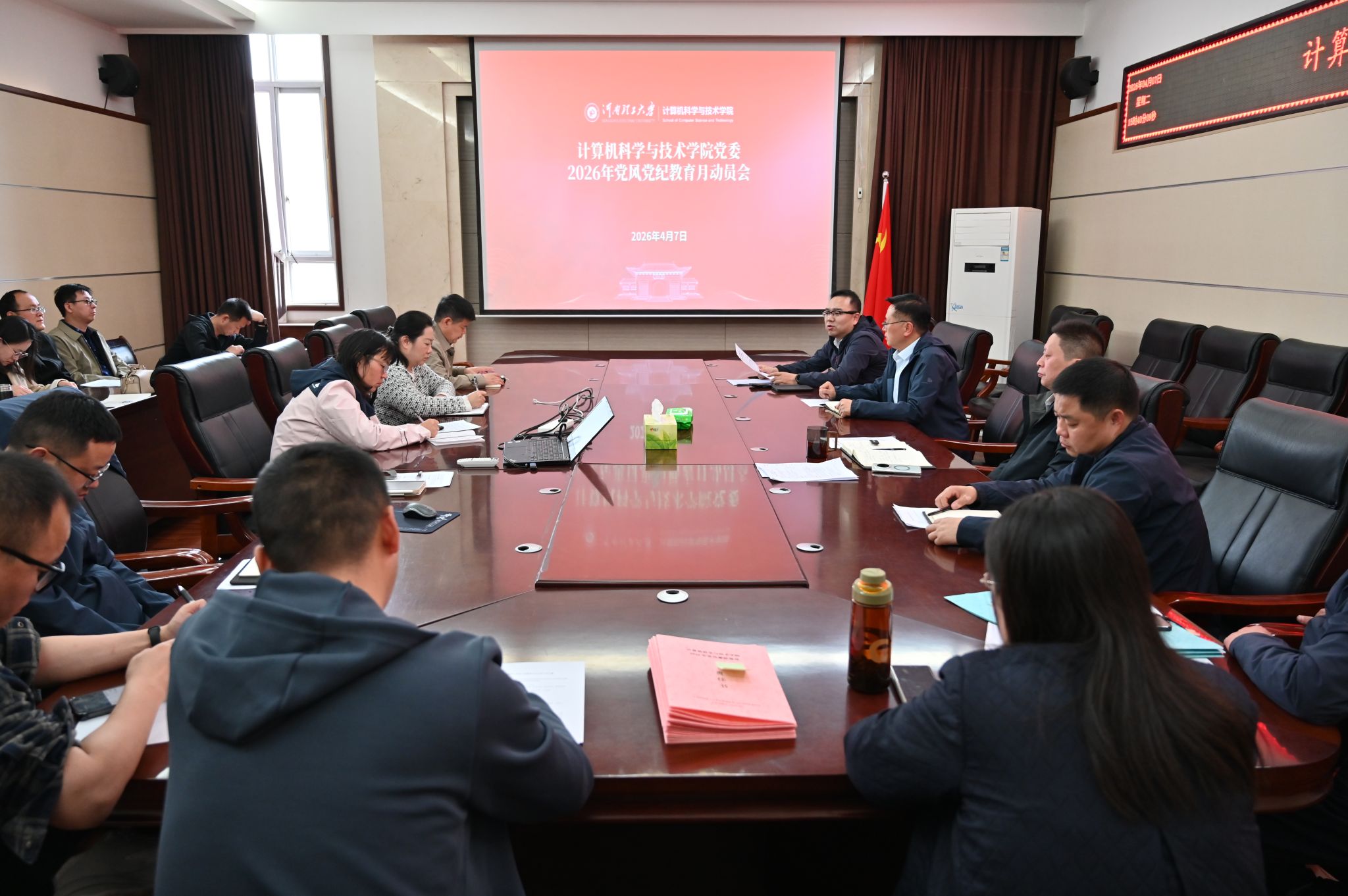 为深入贯彻落实二十届中央纪委五次全会、十一届省纪委六次全会精神,纵深推进清廉学校建设,切实筑牢清正廉洁思想根基,4月7日下午,计算机学院在217会议室召开2026年党风党纪教育月活动动员会。会议以“践行正确政绩观,固本清源促发展”为主题,全面启动学院党风党纪教育月系列活动。学院领导班子、科级干部、党支部书记、系室主任参加会议。